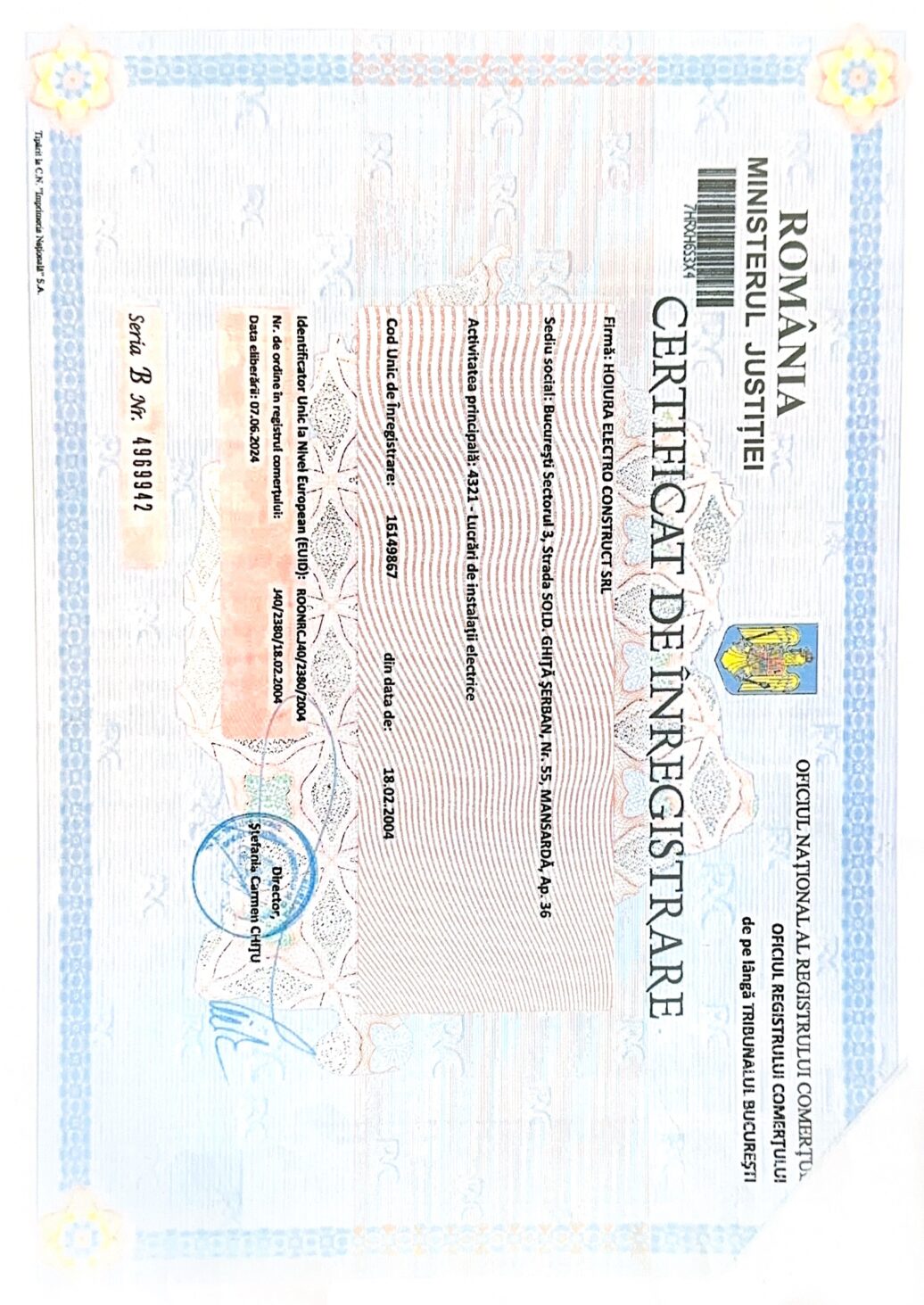Certificare tip C2A pentru "executare de linii electrice, aeriene sau subterane, cu tensiuni nominale de 0.4 kV ÷ 20 kV, posturi de transformare cu tensiunea nominala superioara de cel mult 20 kV, statii de medie tensiune, precum si partea electrica de medie tensiune a statiilor de inalta tensiune".